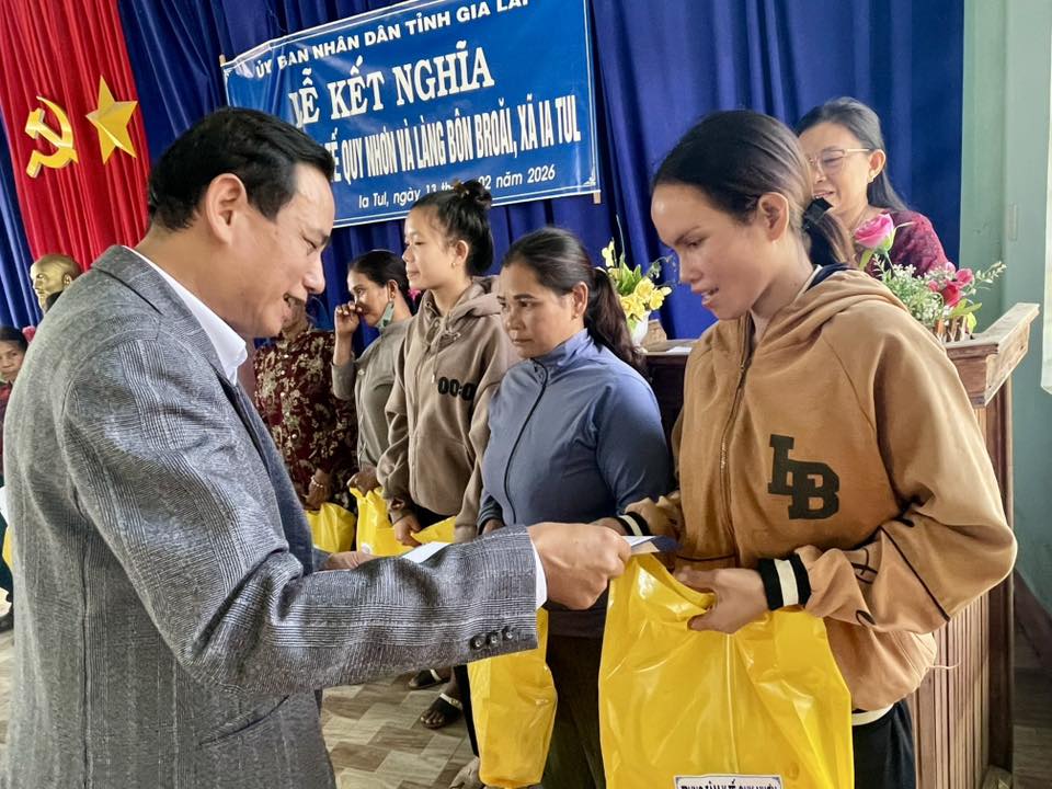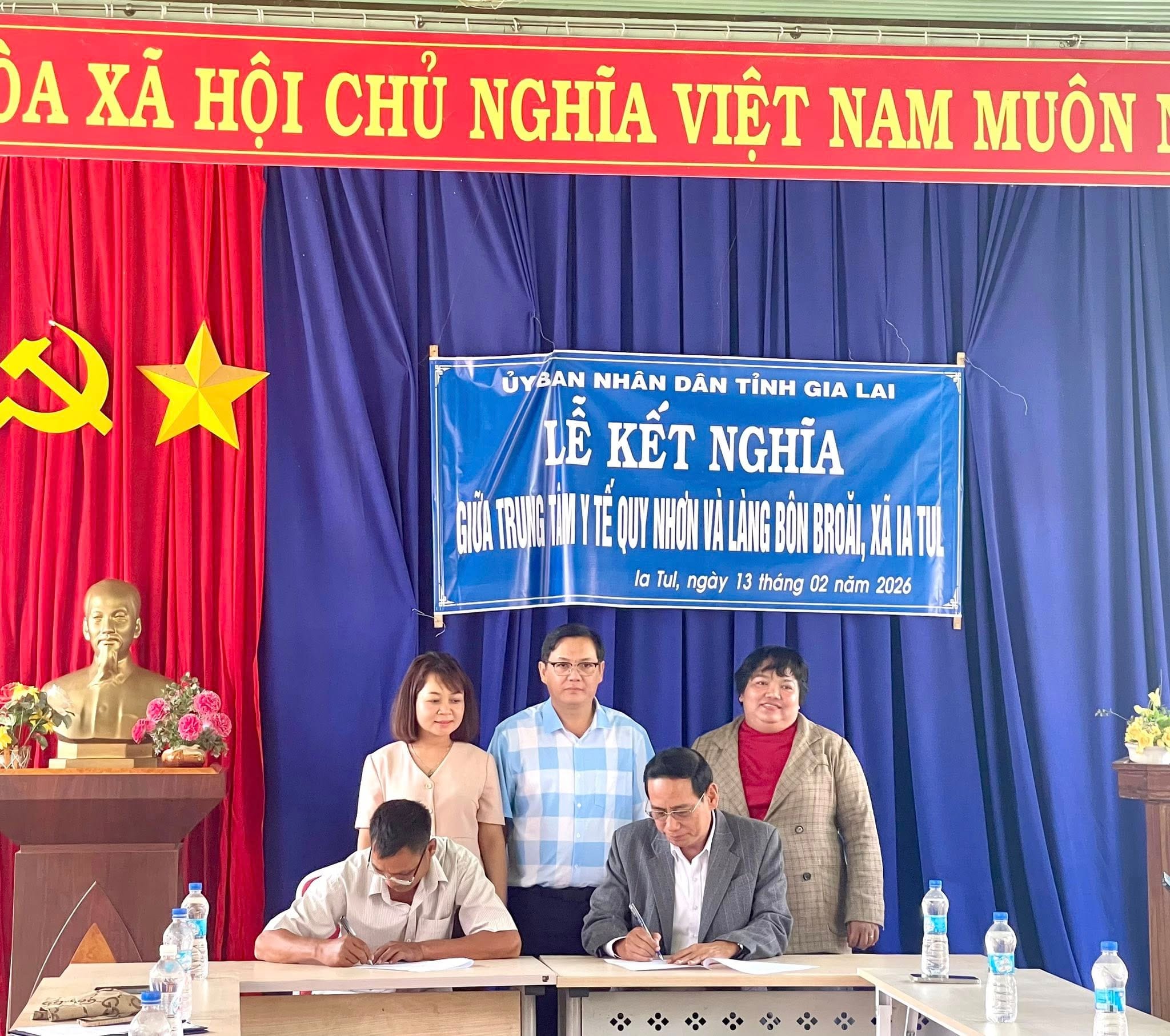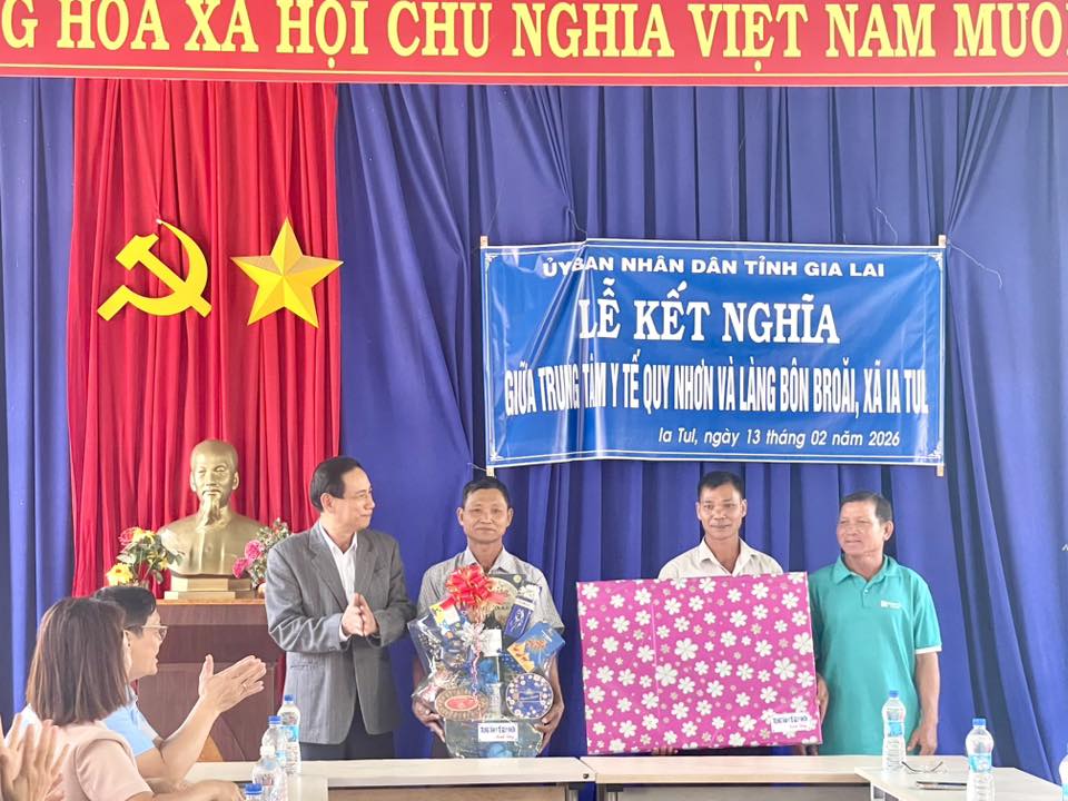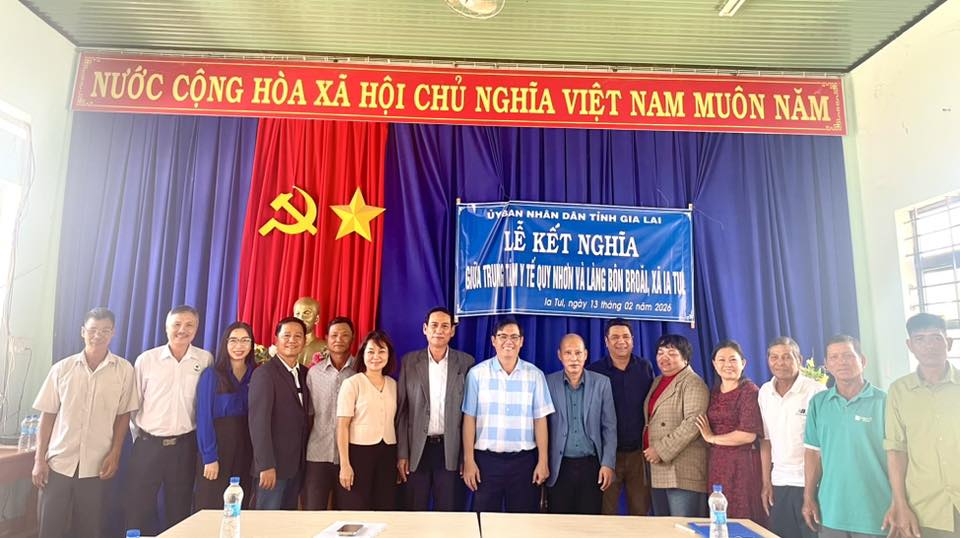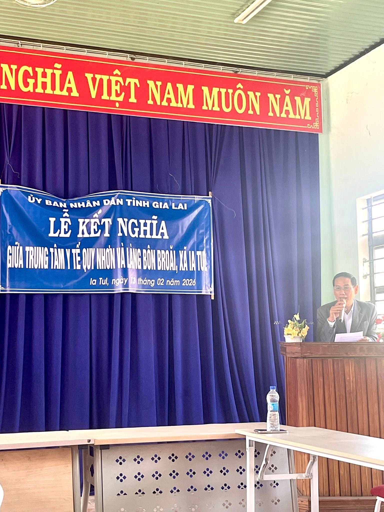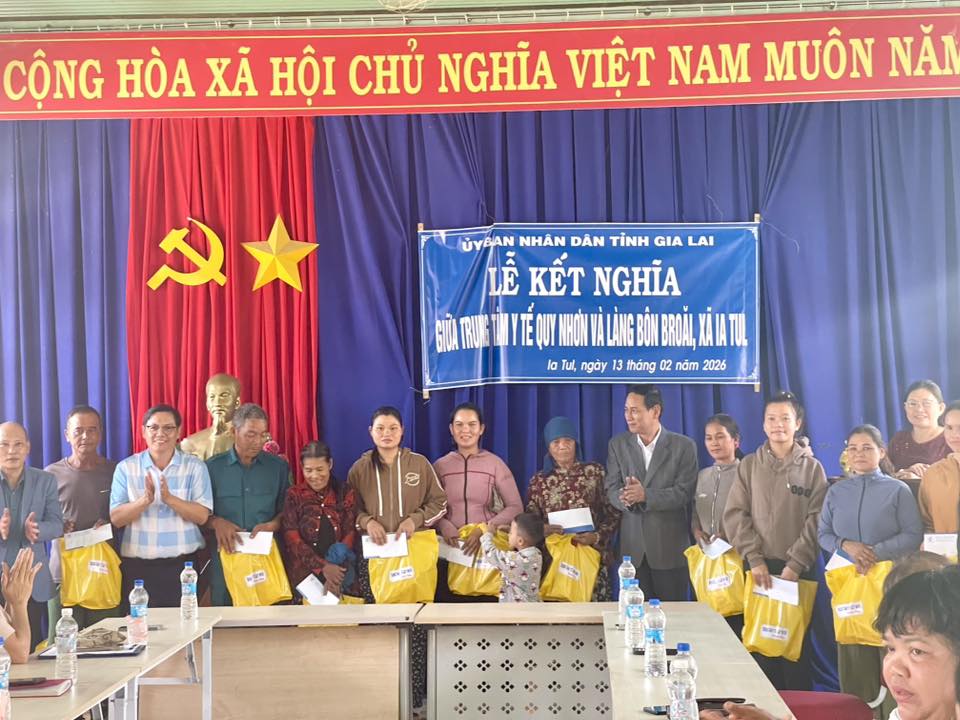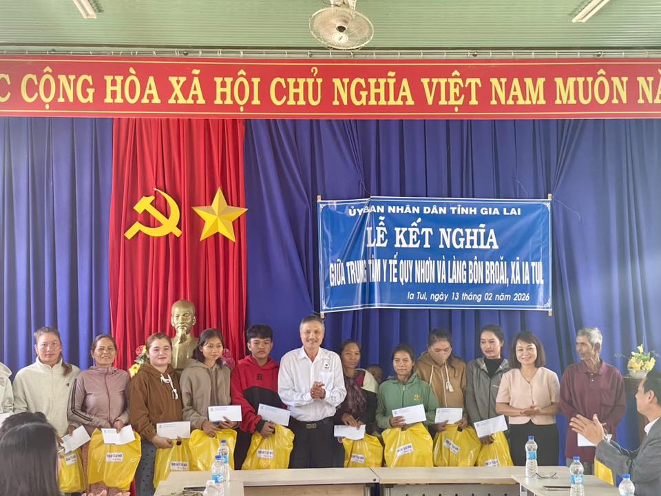Sáng ngày 13/02/2026, tại Nhà sinh hoạt cộng đồng Bôn Broăi, xã Ia Tul, tỉnh Gia Lai, Trung tâm Y tế Quy Nhơn đã long trọng tổ chức Lễ kết nghĩa với Bôn Broăi. Đây là hoạt động có ý nghĩa thiết thực nhằm tăng cường khối đại đoàn kết, thắt chặt tình gắn bó giữa đơn vị y tế với địa phương vùng đồng bào dân tộc thiểu số, đồng thời góp phần hỗ trợ, đồng hành cùng bà con trong công tác chăm sóc và nâng cao sức khỏe cộng đồng.